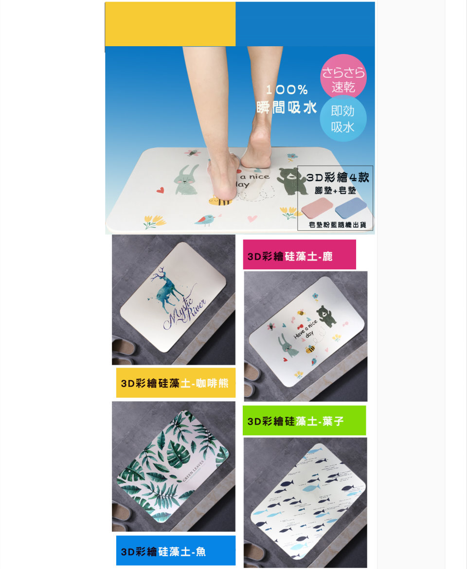 3D彩繪超吸水硅藻土地墊吸水性強,瞬間吸乾腳底水分,乾燥安全防滑,抑菌防霉,除臭消味,讓空氣更清新!